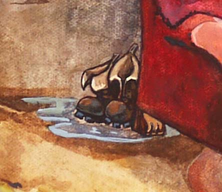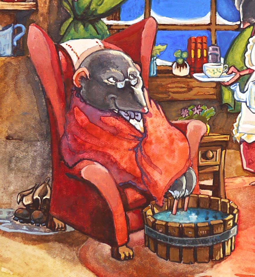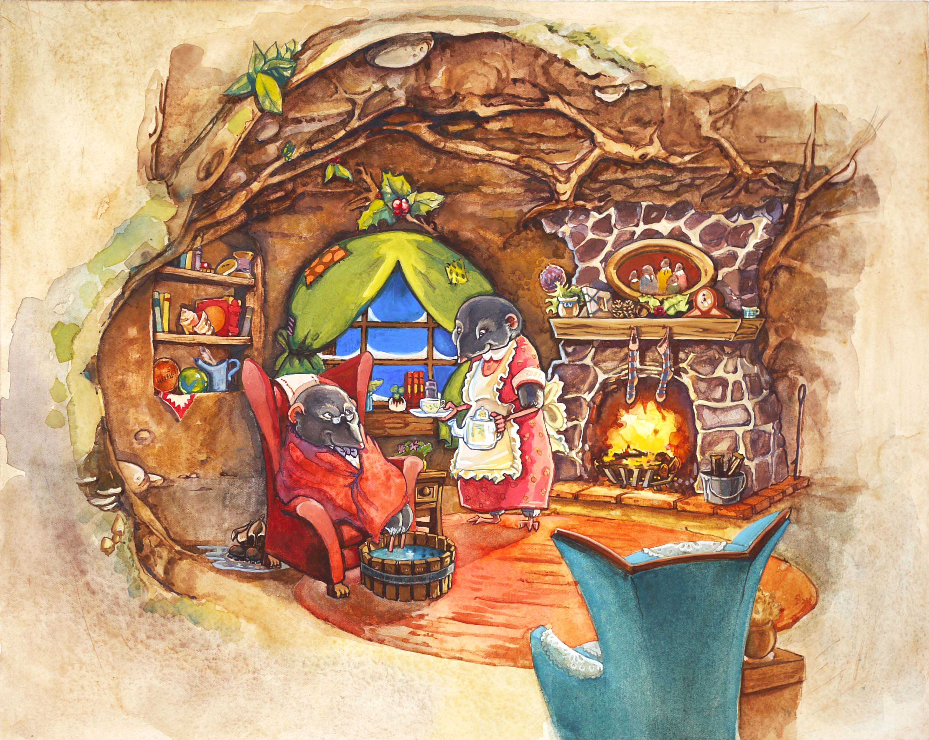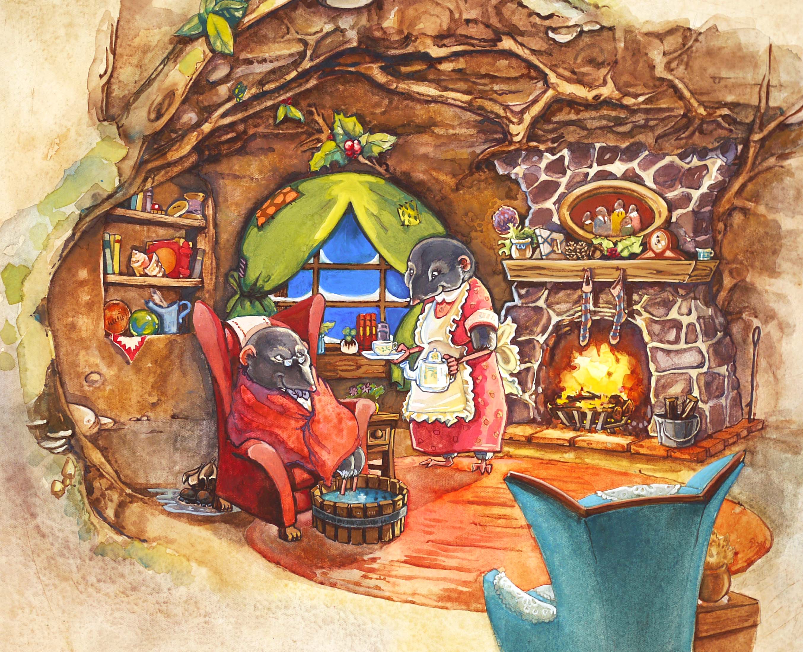 It’s an unwritten goal of mine to paint at least one traditional illustration each year.  While this painting was actually completed in the wee early days of 2014, I still count it towards fulfilling my 2013 year-end goals. Moreover, I am pleased with the timing of this picture because mountains of snow hem my husband and I inside our cozy little house, and we’re keeping the kettle on and the fireplace roaring – in essence, we are Mr. and Mrs. Shrew. That wasn’t my intention, but there you go!